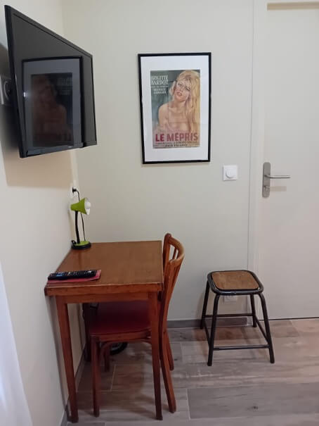 - Équipements en chambre : bureau, chaise, porte bagage, patères/penderie